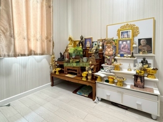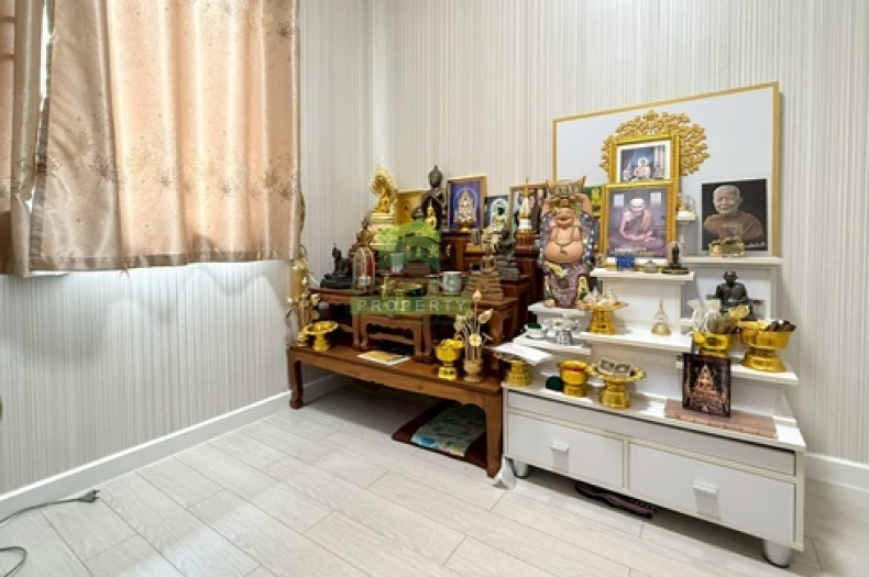 ตกแต่ง : ทาวน์โฮม 2 ชั้น แปลงริม ชั้นล่างพื้นกระเบื้องแกรนิตโต้ สีขาวครีมสวย ชั้นบนพื้นลามิเนต ต่อเติมชั้นลอยห้องพระ/พื้นที่เอนกประสงค์ ต่อเติมครัวหลังบ้านเต็มพื้นที่ เคาน์เตอร์ครัว อ่างซิ้งค์ล้างจาน ต่อเติมหลังคาหน้าบ้านเป็นที่จอดรถ พื้นเทปูน พร้อมมุมสวนข้างบ้าน สวย พร้อมอยู่