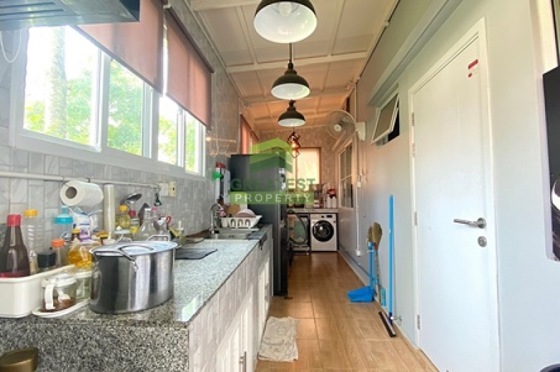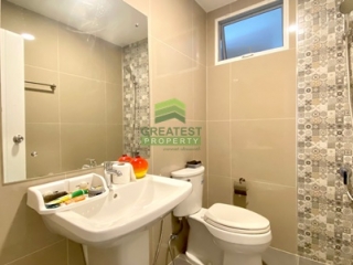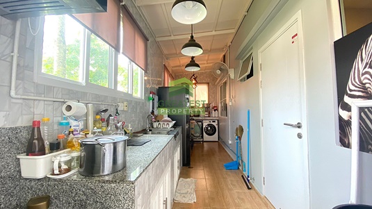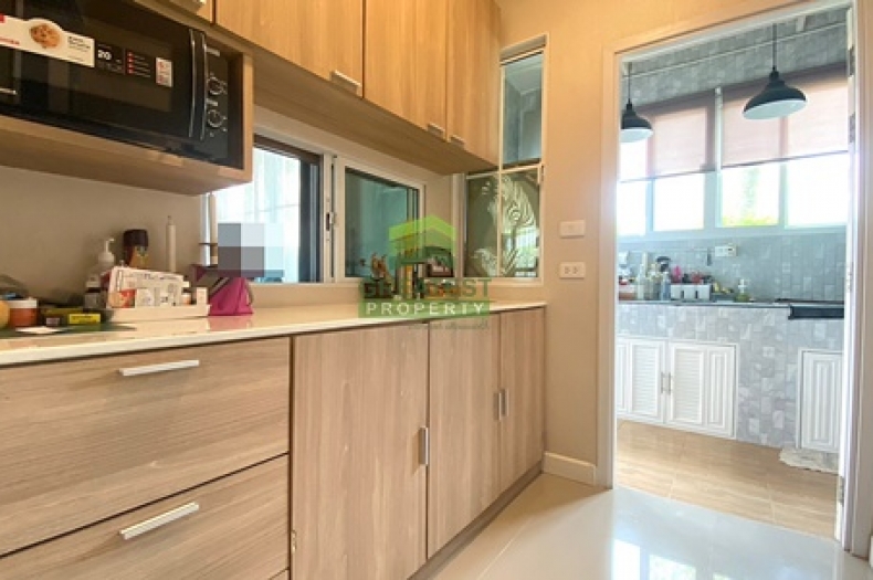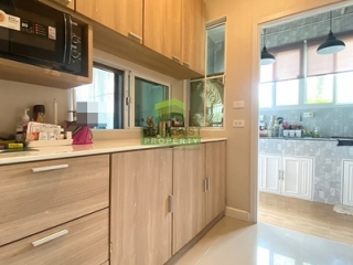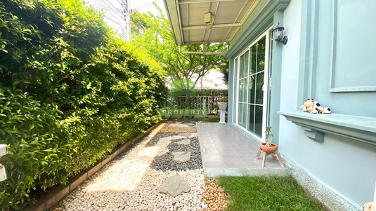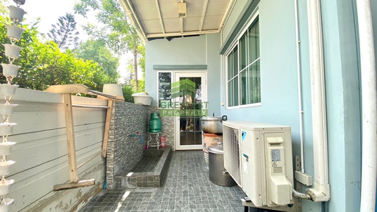 ตกแต่ง : บ้านแฝด หลังริม พื้นที่ใช้สอย 138.48 ตร.ม บ้านหรูสไตล์ Switzerland ติดสวนสาธารณะของโครงการ บรรยากาศร่มรื่น รายล้อมไปด้วยต้นไม้นานาพันธ์ เหมาะแก่การพักผ่อน อยู่อาศัย ชั้นล่างพื้นกระเบื้องแกรนิตโต้ ขนาด 60x60 cm. สีขาวครีม สวย ทำความสะอาดง่าย จัดสรรพื้นที่ใช้สอยได้อย่างลงตัว ภายในแบ่งเป็นครัวฝรั่ง และต่อเติมหลังบ้านเต็มพื้นที่เป็นครัวไทย เคาน์เตอร์ อ่างซิ้งค์ล้างจาน และพื้นที่ซักล้าง บันไดชั้น 2 ทำจากคอนกรีตเสริมเหล็กพร้อมไม้ประสาน ชั้นบนพื้นลามิเนต ระเบียงกว้าง สามารถนั่งเล่น/ จัดสวนหย่อมได้