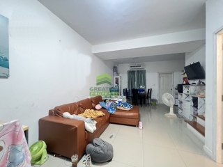 ตกแต่ง : ทาวน์โฮม 2 ชั้น พื้นที่ใช้สอย 125.0 ตร.ม.ชั้นล่างปูพื้นกระเบื้องแกรนิตโต้ขนาด 60×60 ซม.ชั้นบนพื้นลามิเนต ลายไม้หนา 8 มม. ผนังฉาบเรียบทาสี, โคมไฟซาลาเปา, ประตู-หน้าต่างบานเลื่อนเป็นกระจกเขียวตัดแสง กรอบอลูมิเนียมสีขาว ต่อเติมเต็ม พร้อมอยู่